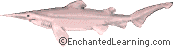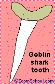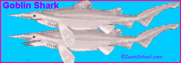 GENERAL DESCRIPTION The Goblin shark is a rarely-seen, slow-swimming shark. This shark's snout is quite unusual; it is long, flat, and very pointed. The jaws can protrude during eating, giving the goblin a very unusual look. This elongated snout may contain electrosensory canals that help this shark find prey. The Goblin shark has soft, pale, pink-gray skin (paler on the belly), low, rounded fins and a long, asymmetrical tail fin. Its jaws can project open quickly in order to catch prey. Like other Lamniform sharks, the Goblin shark has an anal fin, 5 gill slits, 2 dorsal fins, no fin spines, mouth behind the eyes, and no nictitating eyelids. Very little is known about this unusual shark. SIZE The Goblin shark grows to be about 11 feet (3.3 m) long. DIET AND FEEDING HABITS The Goblin shark eats fish (both large and small), including other sharks and rays. They also eat squid and crustaceans (like crabs). TEETH The teeth in the back of the mouth are small and used for crushing prey, like crustaceans. As with other sharks, the teeth are located in rows which rotate into use as needed. The first two rows are used in obtaining prey, the other rows rotate into place as they are needed. As teeth are lost, broken, or worn down, they are replaced by new teeth that rotate into place. SENSES Sharks also have an acute sense of smell. (Shark nostrils are only used for smell and not for breathing, like our nostrils. They breathe using gills, not nostrils.) The sensing of minute electrical discharges in the water is accomplished by a series of jelly-filled canals in the head called the ampullae of Lorenzini. This allows the shark to sense the tiny electrical fields generated by all animals, for example, from muscle contractions. It may also serve to detect magnetic fields which some sharks may use in navigation. HABITAT AND DISTRIBUTION GOBLIN SHARK ATTACKS The Goblin shark is probably harmless, but has rarely been encountered. MIGRATION Unknown REPRODUCTION Unknown SOCIAL GROUPS Unknown LIFE SPAN No one knows the life span of the Goblin shark. POPULATION COUNT Unknown |